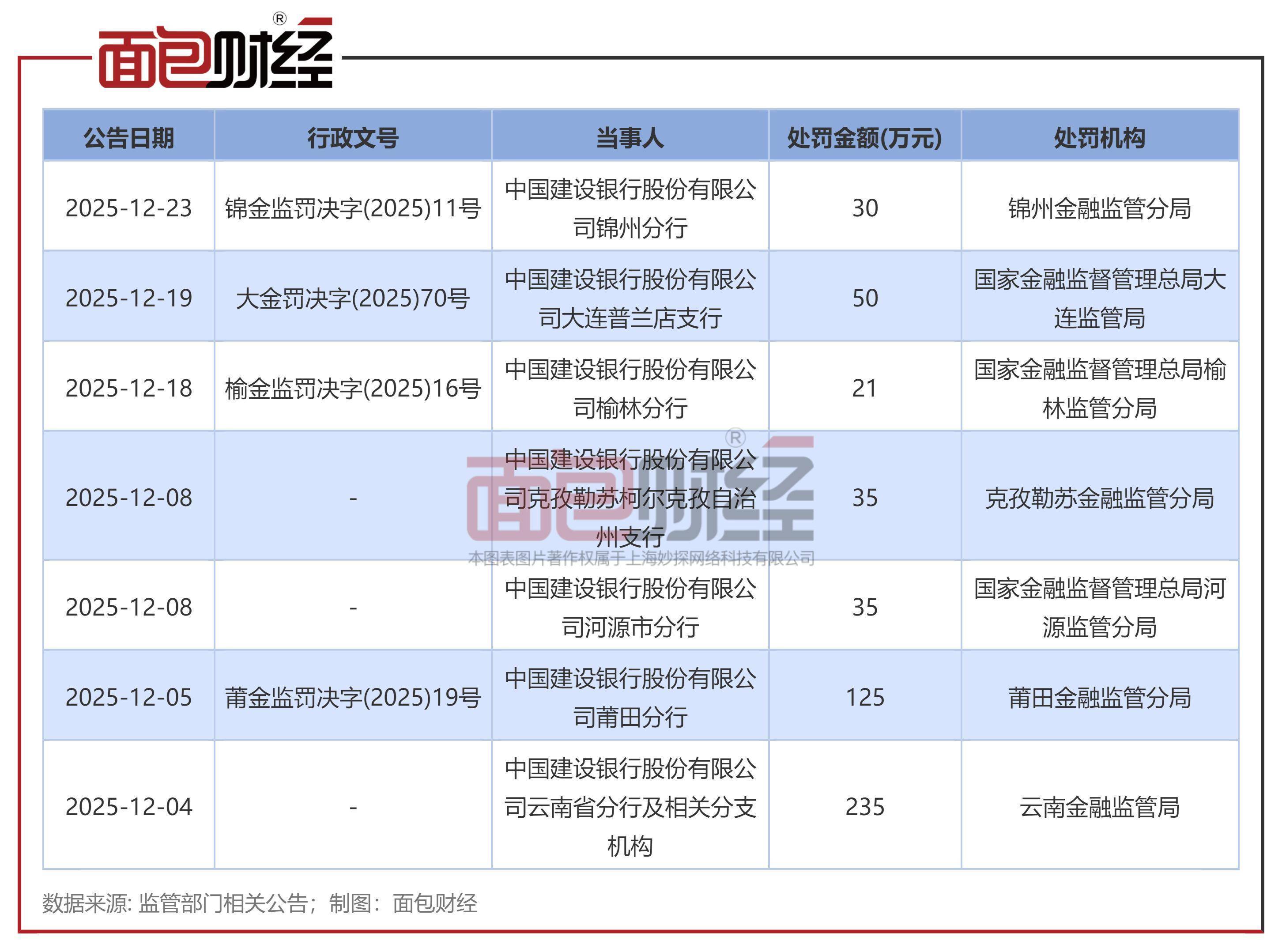 根据公开信息整理,2025年12月以来,建设银行已累计被罚没530万元,其中有两张罚单超过百万。